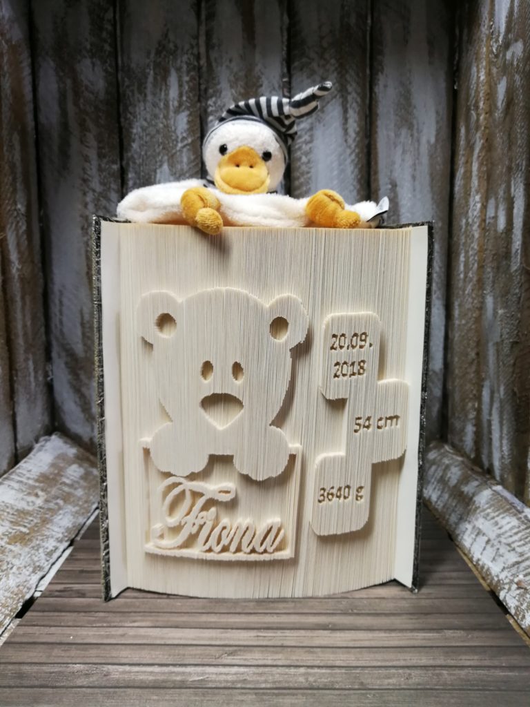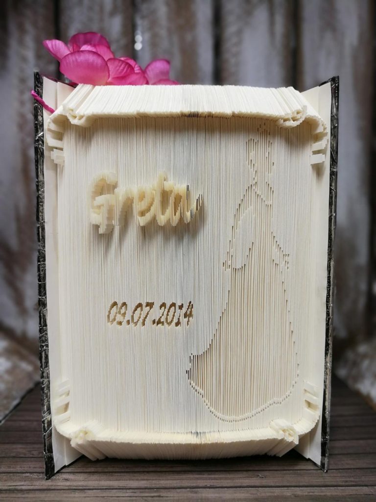 Veröffentlicht am 13. Januar 20199. Januar 2020Hallo BabyNamensschriftzug mit zwei Babyfüßchen. Buch ca. 600 Seiten.Aussen 45 Grad, dann 180 Grad in verschiedenen Ebenen und die Prinzessin in fauler Faltung.